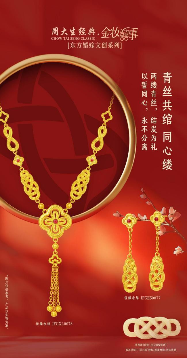 岁月悠悠,柔韧丝线在时光中交织缠绵,仿若情丝,密织成同心结。作为古时常见的经典纹样,同心结承载着深厚的文化意蕴。在古代婚嫁的“合髻”仪式上,新婚夫妻各剪下一缕头发,合而作一结,以誓天赐良缘,更寓意从此结发同心、患难与共。周大生经典取同心结之意,赋予金妆囍事系列“佳缘永结”之形。每处细节都几经打磨,编织出情丝万千,赠予东方佳偶,盟定今朝好姻缘。同心结的中心亦缀有红色珐琅,如同爱情的核心,炽热而坚定;亦祈愿情长岁久,永不渝初。