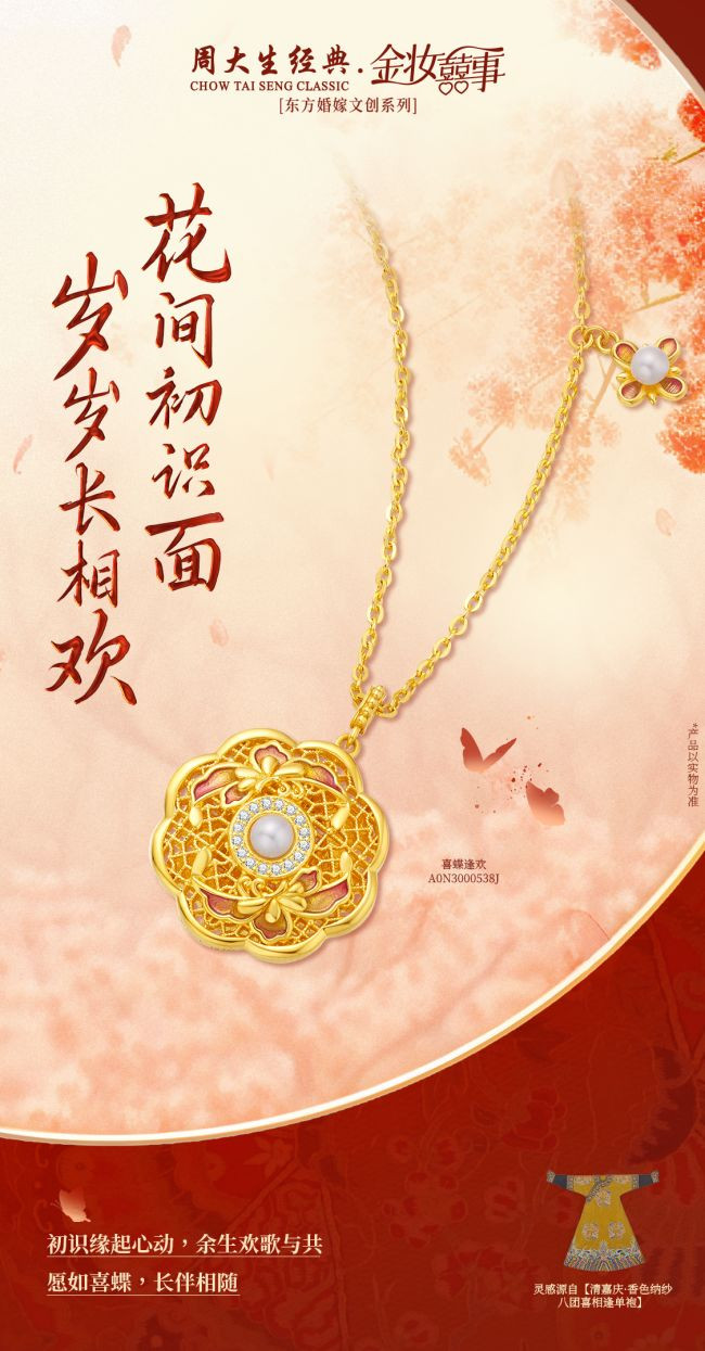 花香满溢,蝶影翩跹。周大生经典金妆囍事系列“喜蝶逢欢”,灵感源自东方爱情符号“喜相逢”纹样。运用灵动的黄金工艺,刻画出喜蝶双飞、甜蜜相依的场景,辅以舒展的枝叶和盛开的花朵,传递出喜自相逢,佳偶成双的唯美祝福。“喜蝶逢欢”将浪漫的爱情故事转化为人间的永恒符号,不仅彰显了传统婚嫁文化的温暖与深邃,更让佩戴者在举手投足间,感受到传承已久的祝福与美好期许。