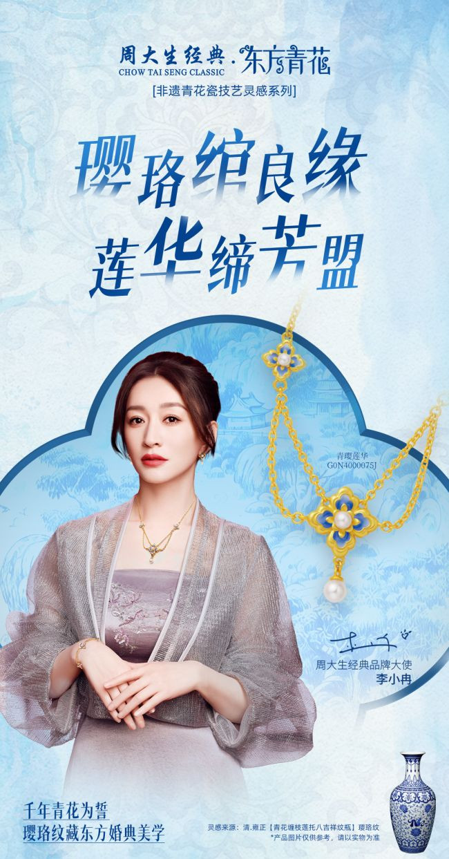在古代,璎珞是菩萨颈部的装饰品,象征着无尽的光明。宣德时期,璎珞频繁出现在官窑瓷器上,则代表着尊贵与永恒。而莲花作为圣洁的象征,其“出淤泥而不,濯清涟而不妖”的特质,恰似爱情中的纯洁与坚定。周大生经典东方·青花系列“青璎莲华”取璎珞之形,绘莲花之神,于黄金之上,以青花色珐琅晕染。璎珞灵动似丝线,缠绕于莲花茎干;又似星辰洒落,点缀于花瓣之间,为莲花增添几分神秘与华贵。莲花初绽,瓣瓣含情,似在诉说爱情的忠贞与安然。璎珞之繁复,莲花之清逸,二者在黄金上相融,便是爱情华贵与圣洁的完美化身,深刻诠释了“一见倾心,白首不相离”的爱情誓言。